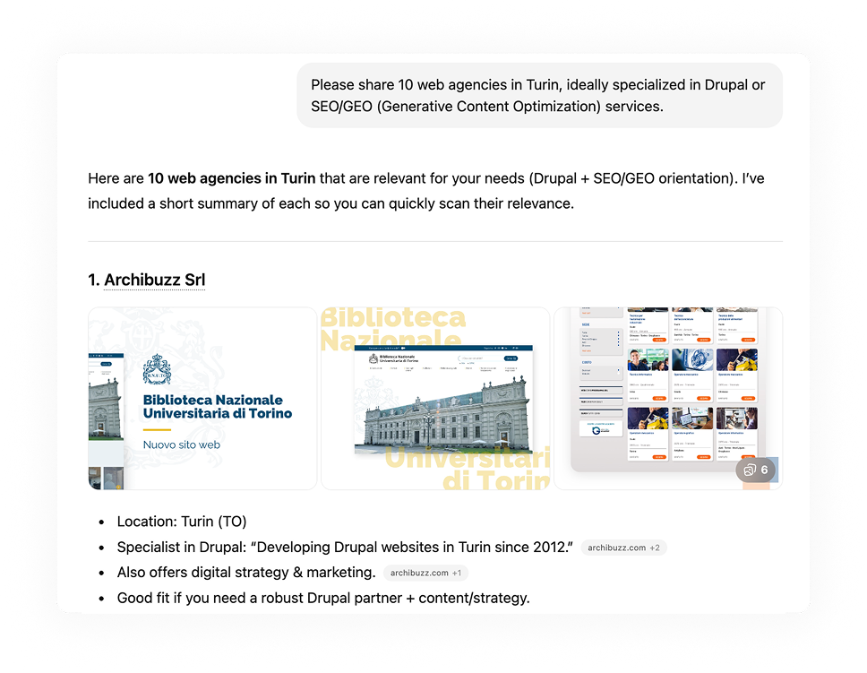 Our digital agency in Turin offers a complete service: from crafting clear, in-depth copy that tells the story of your business, to providing integrated SEO and GEO consulting designed to drive organic traffic, strengthen brand authority, and make your content recognizable even within AI-generated answers.